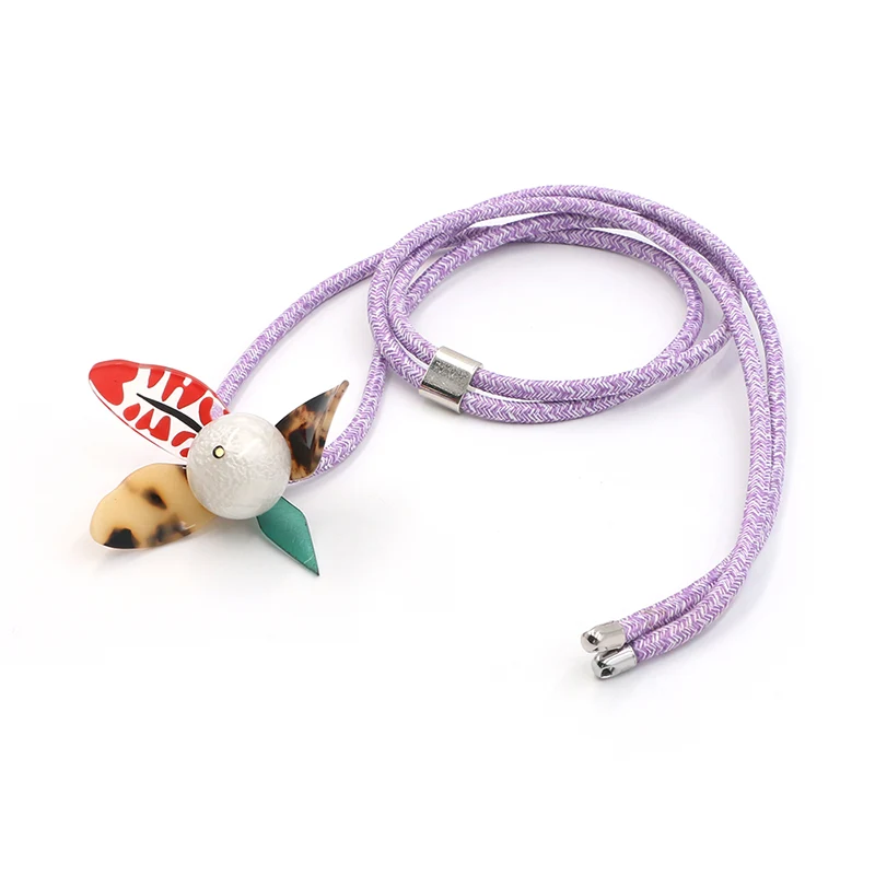 Το αντίστοιχο μοβ μακρύ σχοινί έχει μοναδικές λευκές γραμμές, οι οποίες συμπληρώνουν το κρεμαστό. Ο δακτύλιος ασημιού και το καπάκι στο τέλος του σχοινιού είναι εξαιρετικοί και συμπαγείς, το οποίο δεν είναι μόνο βολικό για την ρύθμιση του μήκους, αλλά προσθέτει επίσης λίγο υφή μόδας, καθιστώντας το κολιέ μαργαριτάρι λουλουδιών να διακοσμήσει εύκολα το ντύσιμο σας.