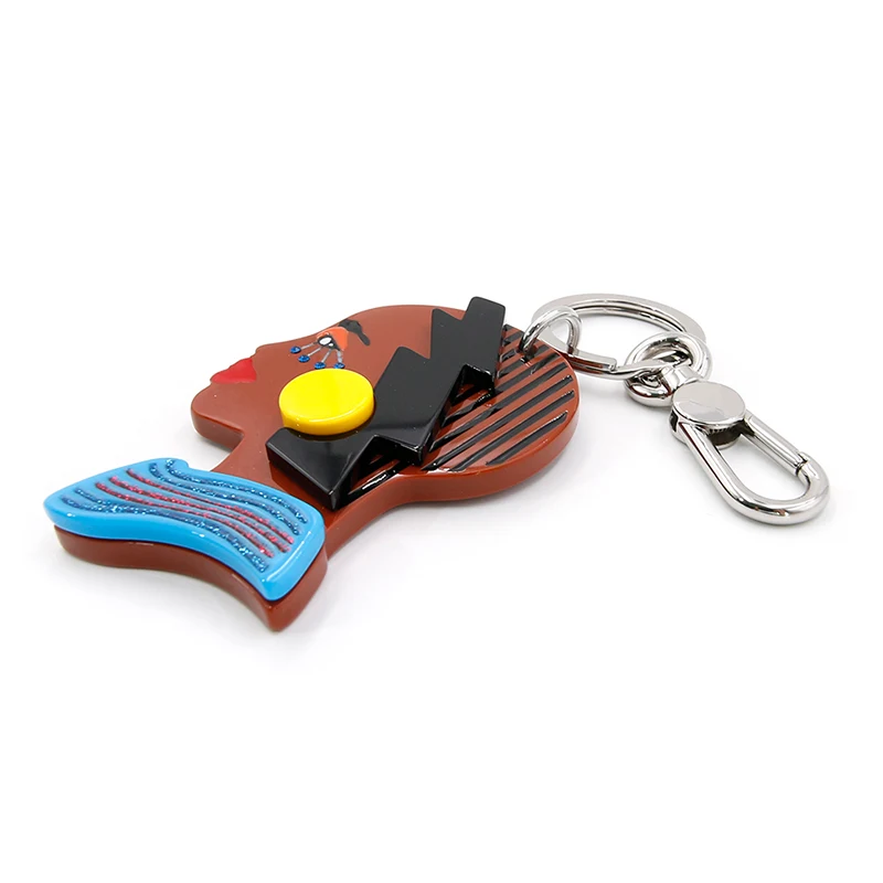 Το άτομο στο πορτρέτο μπρελόκ έχει καφέ δέρμα σαν αφρικανικό ντόπιο, κόκκινο χείλος ταιριάζει με την κόκκινη σκιά ματιών, ένα μπλε κολάρο ταιριάζει με τις μπλε βλεφαρίδες και ένα φωτεινό κίτρινο σκουλαρίκι είναι διακεκομμένο δίπλα στα μαύρα μαλλιά.